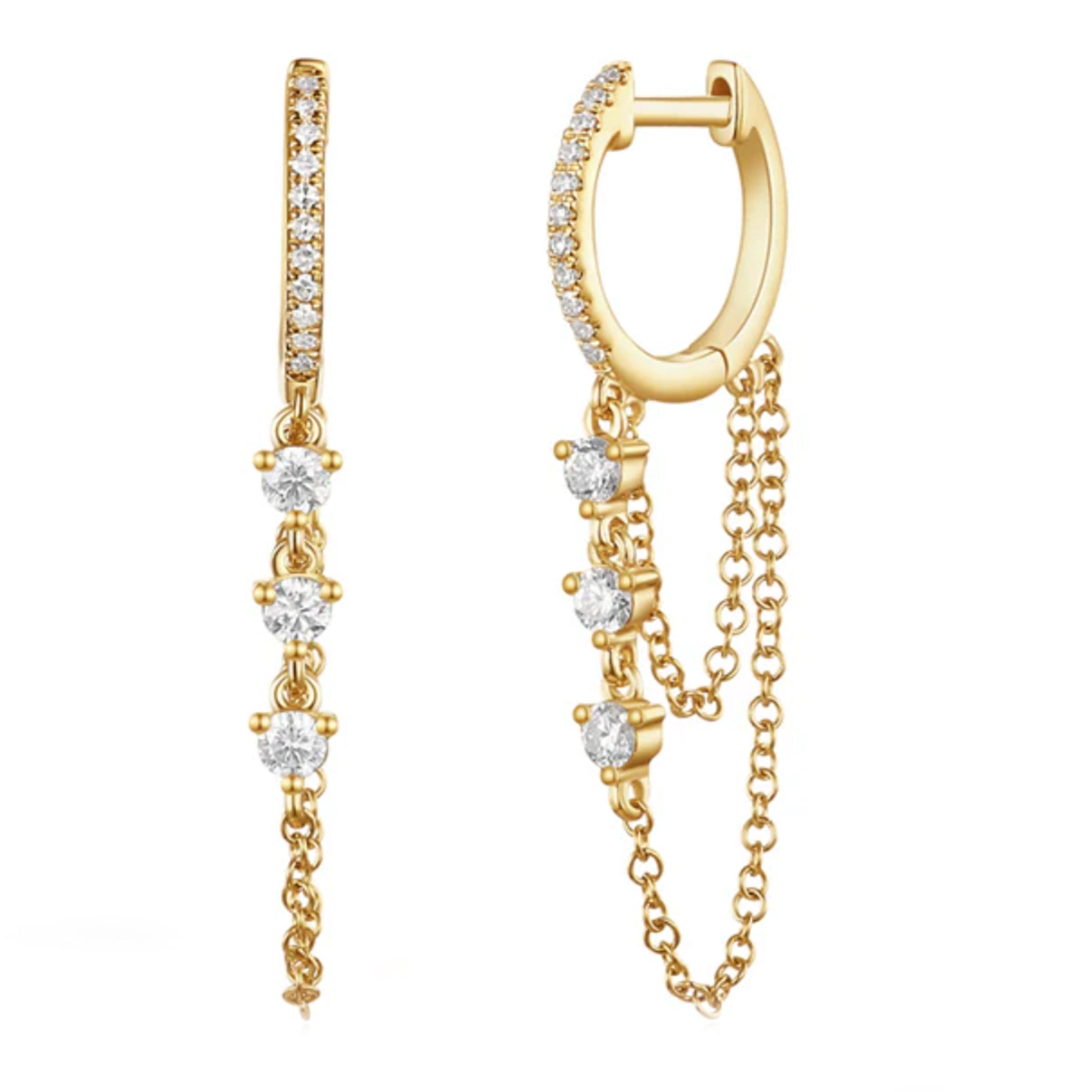 14K DIAMOND HOOPS WITH THREE DIAMONDS AND DANGLING CHAIN